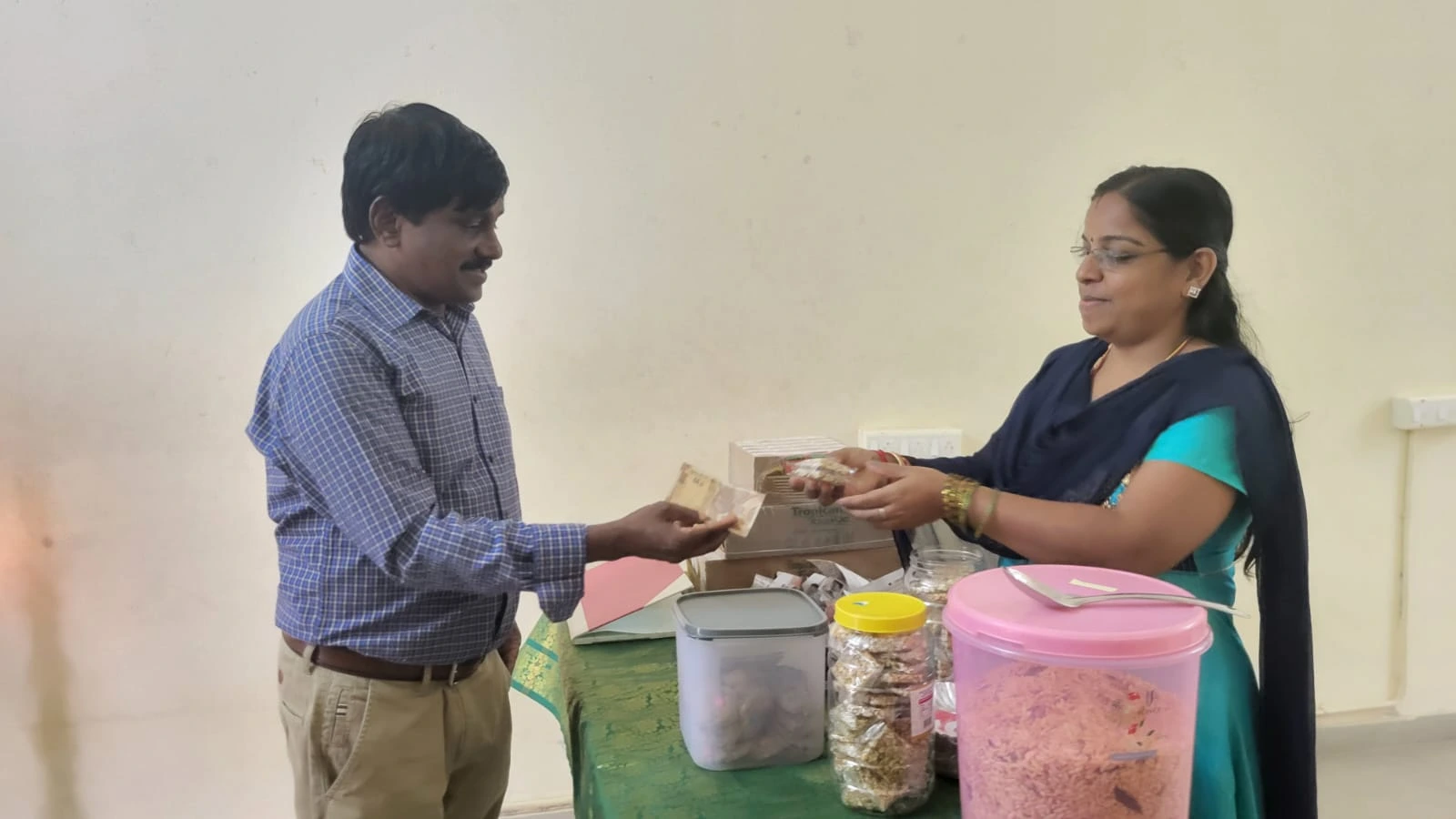 On the first day, we sold homemade masala pori, cookies, peanut candy, juice, and samosa. Students and staff bought their favourite items and enjoyed. We are looking forward to continue the service with new and healthy items.